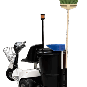 Es compatible con cubos de 95 litros e incorpora múltiples soportes para herramientas habituales de limpieza viaria, optimizando el trabajo diario de los operarios.